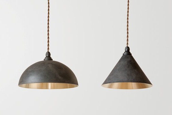 そんな高岡の鋳物メーカーである(株)二上とデザイナーの大治将典 氏によって開発された真鍮鋳物のペンダントランプです。こちらは外側が高岡鋳物が培ってきた真鍮の伝統的着色技法『黒ムラ』で仕上げられております。『黒ムラ』は、漆をベースに顔料を混ぜて調合した塗料で着色し、その後、熱を加えながら刷毛を使って「おはぐろ」を擦り込み、ムラや表情をつけていきます。高岡鋳物に古くから伝わる着色技法です。一般的な塗装やメッキとは異なり、ひとつひとつ表情があり暖かみのある古美な金属の表情を作ります。経年変化により、味わい・色味が深まり、真鍮鋳肌と同じように深い色に落ちつきます。内側は削り出しの仕上げになっており、光が綺麗に反射します。シーリングカバー部分まで真鍮鋳物で制作された徹底ぶりも素晴らしい照明です。