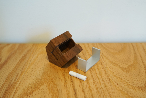 木とアルミ、異素材を用いて構成された小さな家型の小物入れです。