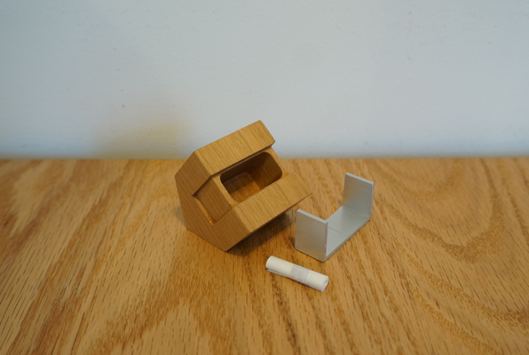 木とアルミ、異素材を用いて構成された小さな家型の小物入れです。