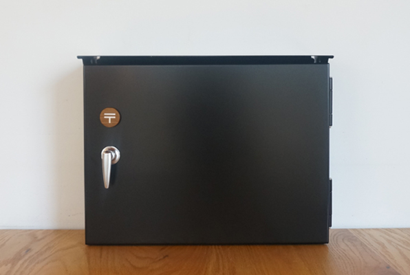 上蓋が手前の扉に被ってますので、最初に上蓋をあけてからハンドルをひねって手前の扉を開けます。なので2アクションで郵便物を取り出す事になります。無言の鍵というようなイメージで制作しております。(type-2で上蓋をあけずに強引に手前の扉をあけようとすると本体が変形する原因となりますのでお気をつけくださいませ。)