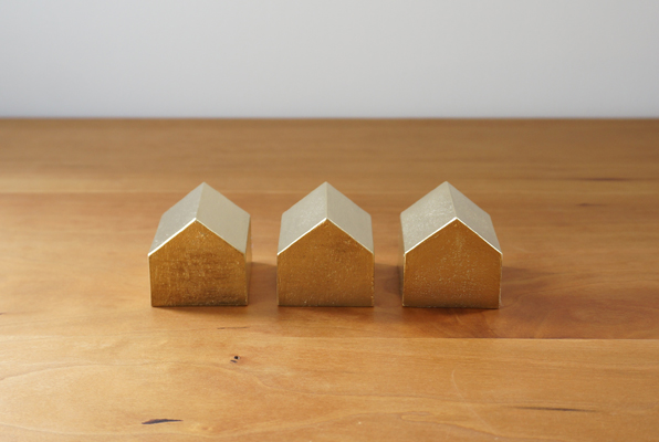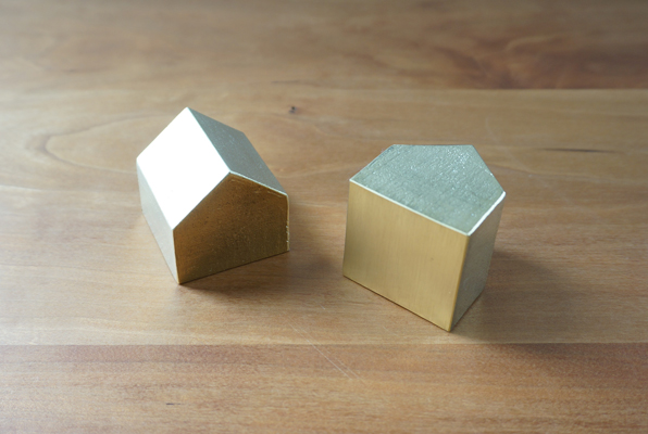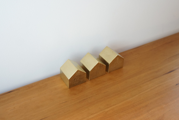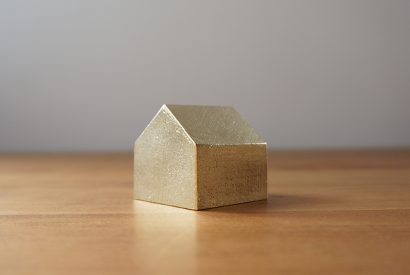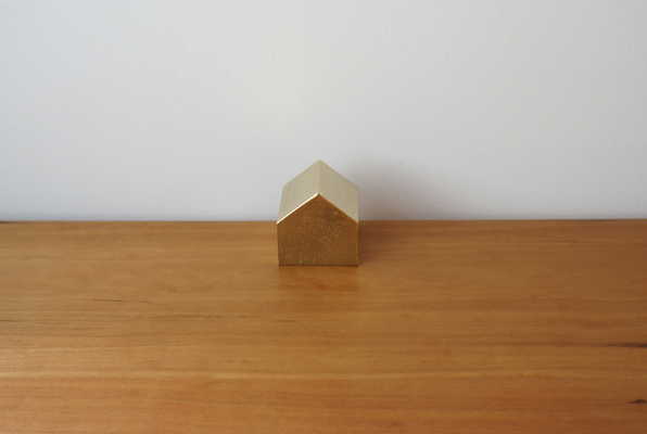 富山県高岡市の伝統産業である真鍮鋳物の技術を用いて制作した家型のペーパーウェイトです。 砂型のみで一つ一つ手作業で成型され、その表面は真鍮鋳物特有のムラが現れます。 この【鋳肌】タイプはそういった部分もプラスにとらえて制作しております。 最初は金色の輝きが強いですが、経年変化で味わいのある色合いに次第に変化していきます。 しっかりとした重量感と真鍮の美しい雰囲気が共存する小さなイエです。