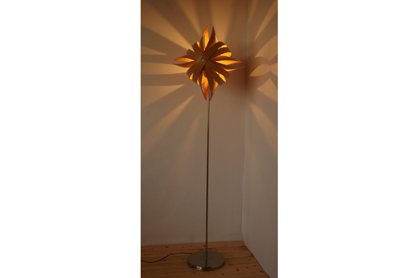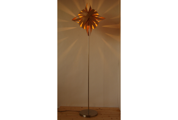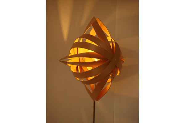 この照明は日本の伝統工芸(曲げわっぱ)の技法を用いた作品です。素材に秋田杉を使用する事によって、視覚的インテリアと嗅覚的インテリアを実現させております。明りを燈す事によって杉独特の香りが楽しめます。ワッパシェードのフロアタイプです。部屋のコーナーなどに置くと美しい光と影が壁に映し出されます。