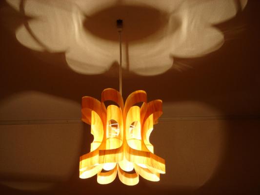 木目や水の流れは人の心を落ち着かせる効果があるとされています。 素材には透明のP.P.(ポリプロピレン)の表に桜突き板を貼り付ける事により木目を際立たせ内面からの"癒し"と考え制作されています。形、光はP.P. SHADE同様、天井や壁に花の形や色んな表情の光と影を作り出します。 ※コード長さは450mmです。 ※60w E-26クリア球(100wまで対応します。) ※引掛シーリング 【納品例】 2014年08月 / 岩手県 A様 邸