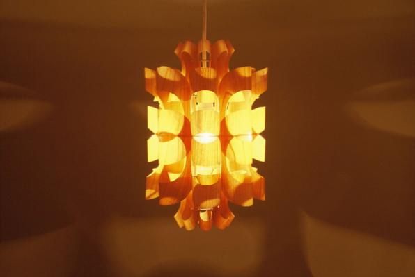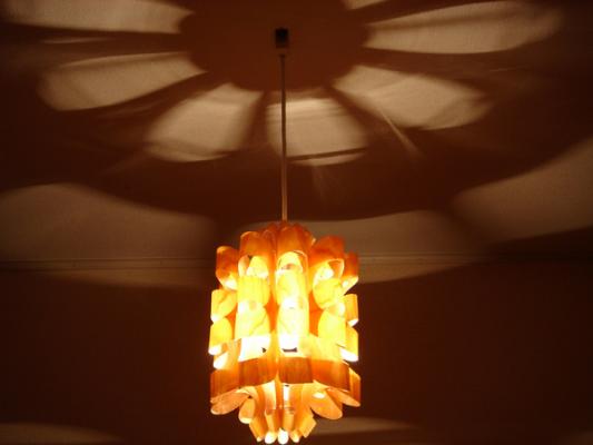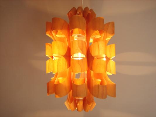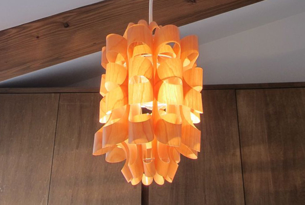 素材には透明のP.P.(ポリプロピレン)の表に桜突き板を貼り付ける事により木目を際立たせ内面からの"癒し"と考え制作されています。形、光はP.P. SHADE同様、天井や壁に花の形や色んな表情の光と影を作り出します。