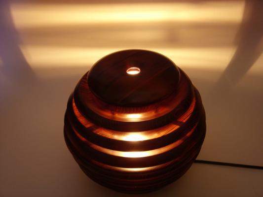 木材を高速回転させながら削り、主に盆や椀などで使われています。素材にはマツ科のツガを使用。塗装にはウレタン塗装より傷の付き難いアミノ塗装をしています。9枚の板を円形に削り間隔を開け重ねていますのでその隙間からもれる明かりにより壁に光のラインを作り出します。昔の日本の行灯のイメージで部屋のメインの明かりではなくイメージ作りの間接照明として制作されてます。電球は少し特殊なタイプですが、大型電気店。専門店などでも取寄せ可能です。