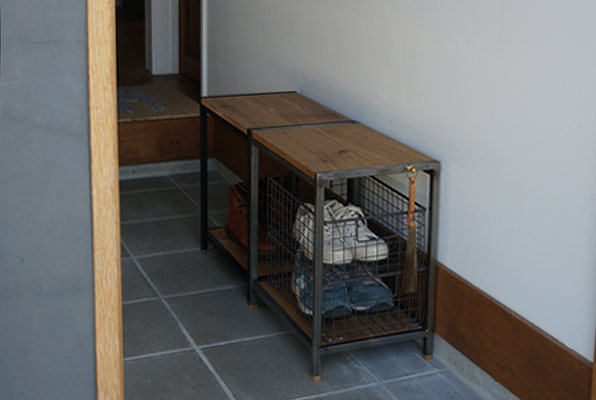 そもそもスツールという家具は様々なシチュエーションで使用される家具です。リビングやダイニングで普通に座るスツールとして、玄関先で靴を履くとき用として、ソファ脇のサイドテーブルとして、ベット脇のナイトテーブルとして、高い所のものを取る時に踏み台だったり、洗面台や脱衣所などで使っても良いかもしれない。そんなところから家具ではあるけど、サイズも小さいし、とても重宝する道具感が強い家具かと思います。下段を作った事で様々なモノをそこに納める事が可能です。サイズ感は既製品のカゴやバスケット、書類のサイズなど様々なモノを採寸して割り出した寸法になってます。また、奥行きを比較的狭くした事で、家の中の様々な所で使い勝手の良いモノになりました。デザインし過ぎず、椅子や収納の寸法から追っていきできた実用サイズです。結果パッと見は普通ですが、サイズ感や細かい納まりは既製にはあまりない仕上がりになりました。