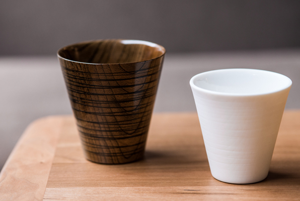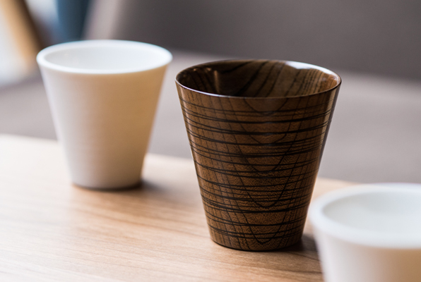 木地は岩手県九戸郡洋野町の職人さんに極力薄く挽いてもらい、外側にランダムに筋を入れる事でよりシャープな雰囲気を作りだしました。口当たりも良く、握った時の手にすっと馴染む感じがとても心地よいカップです。お酒や焼酎など冷たい飲み物からお茶やコーヒーといった温かい飲み物まで幅広くお使い頂けます。黒と茶は拭き漆、ナチュラルはウレタンで仕上げております。ギフトなどにもオススメです。