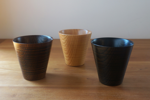 木地は岩手県九戸郡洋野町の職人さんに極力薄く挽いてもらい、外側にランダムに筋を入れる事でよりシャープな雰囲気を作りだしました。口当たりも良く、握った時の手にすっと馴染む感じがとても心地よいカップです。お酒や焼酎など冷たい飲み物からお茶やコーヒーといった温かい飲み物まで幅広くお使い頂けます。黒と茶は拭き漆、ナチュラルはウレタンで仕上げております。ギフトなどにもオススメです。