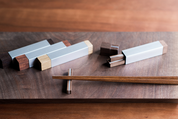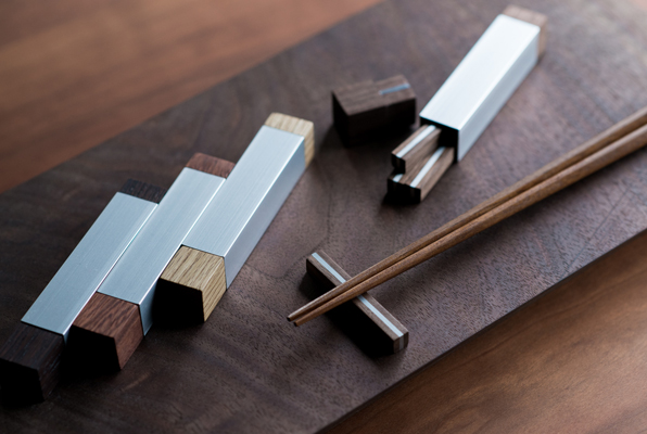 木とアルミ、異素材で構成されたケース付きの収納まで考えられた箸置きセットです。木の蓋を開けると中に4つ箸置きが収納されております。蓋に樹脂板を挟む事により、木の伸縮によって蓋がゆるんだりという事が無いよう、細工が施されております。異素材の組み合わせの難しい部分を逆にデザインに取り込んだ作りになっております。木でサンドイッチされたアルミ、シャープな雰囲気と共に箸置き自体がウエハースのようでどこか美味しそうな雰囲気も。テーブルの上など常に見えるところに置いておきたい、そんな藤沢さんの箸置きセット。ギフトにも喜ばれそうなアイテムです。