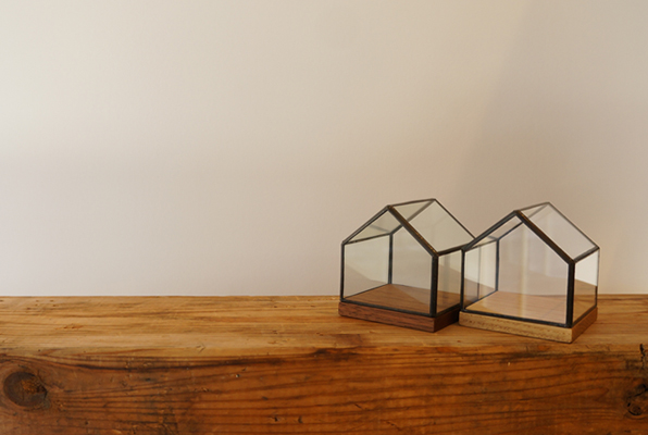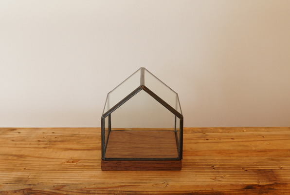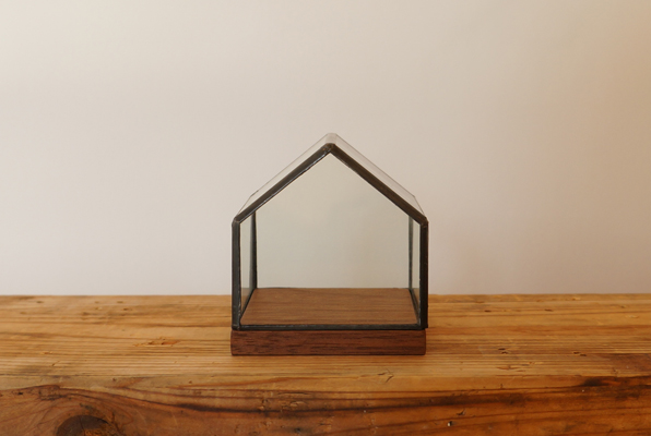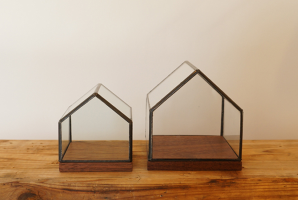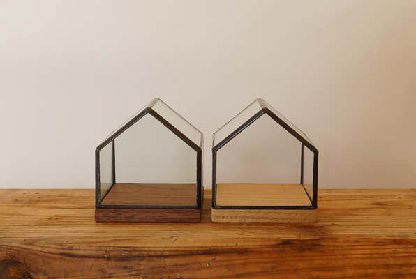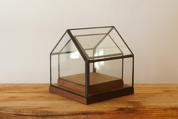 木のベースの製作は花巻の藤澤康さんにお願いしナラとウォールナットの2種類。ガラス部分は僅かではありますが、サイズに個体差ありますので、少し手間かかりますが、一つ一つ合わせて制作して頂いております。そんな小さな家型のショーケースです。お好きな 『 ~ in HOUSE』にして下さいませ。